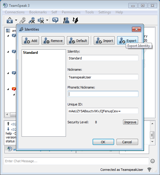 The first thing you should do when planning on using my TeamSpeak server for a longer period of time is backing up your TS identity. It's the one thing that, well, identifies you within the TeamSpeak network. Everything is tied to this identity: Your levels, channel access, permissions. Reinstalling your operating system or properly uninstalling TS will cause loss of the files in question. If you lose your TS identity you lose everything on my and other servers. And there is no way of getting it back if you don't know the server admin personally. And even then possibilities are limited.